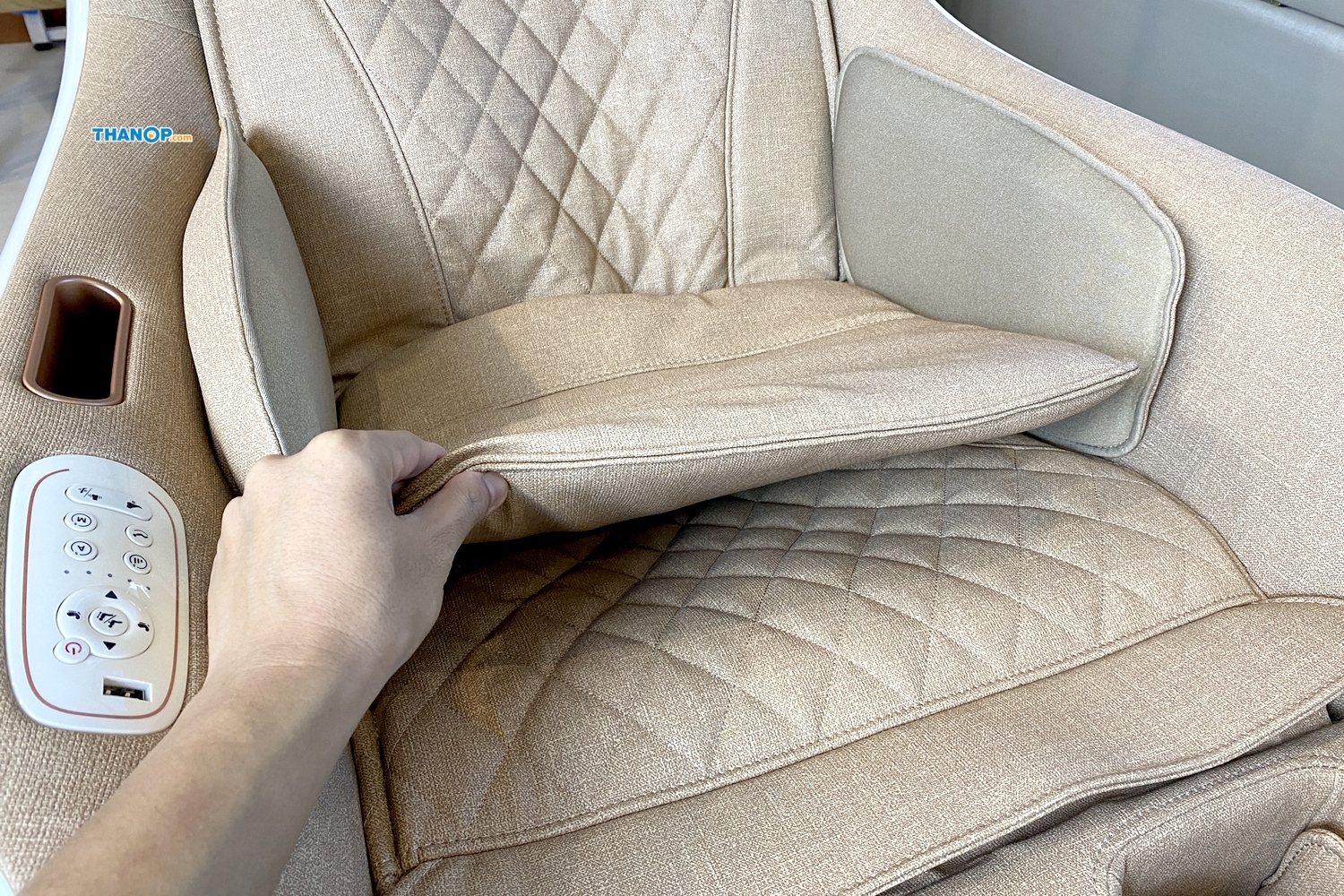 3. Pillow Pad (หมอนรองศีรษะ) : ถูกยึดติดกับตัวเครื่องด้วยแถบซิป ถือว่ามีการยึดติดที่แน่นหนา และยังสามารถพับไปไว้ด้านหลัง หรือจะถอดออก ได้ง่ายๆ ในกรณีที่ต้องการให้ลูกกลิ้งนวด นวดกันแบบถึงพริกถึงขิง